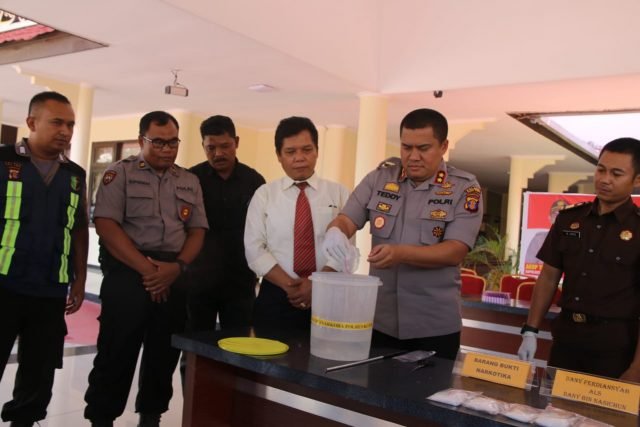 Kapolres Kutim AKBP Teddy Ristiawan, Israq Dari Kejaksaan Negeri Serta Perwakilan PN Sangatta Serta BNK Kutim, Musnahkan BB Shabu Ke Dalam Air Panas. (Foto: Wak Hedir Humas)