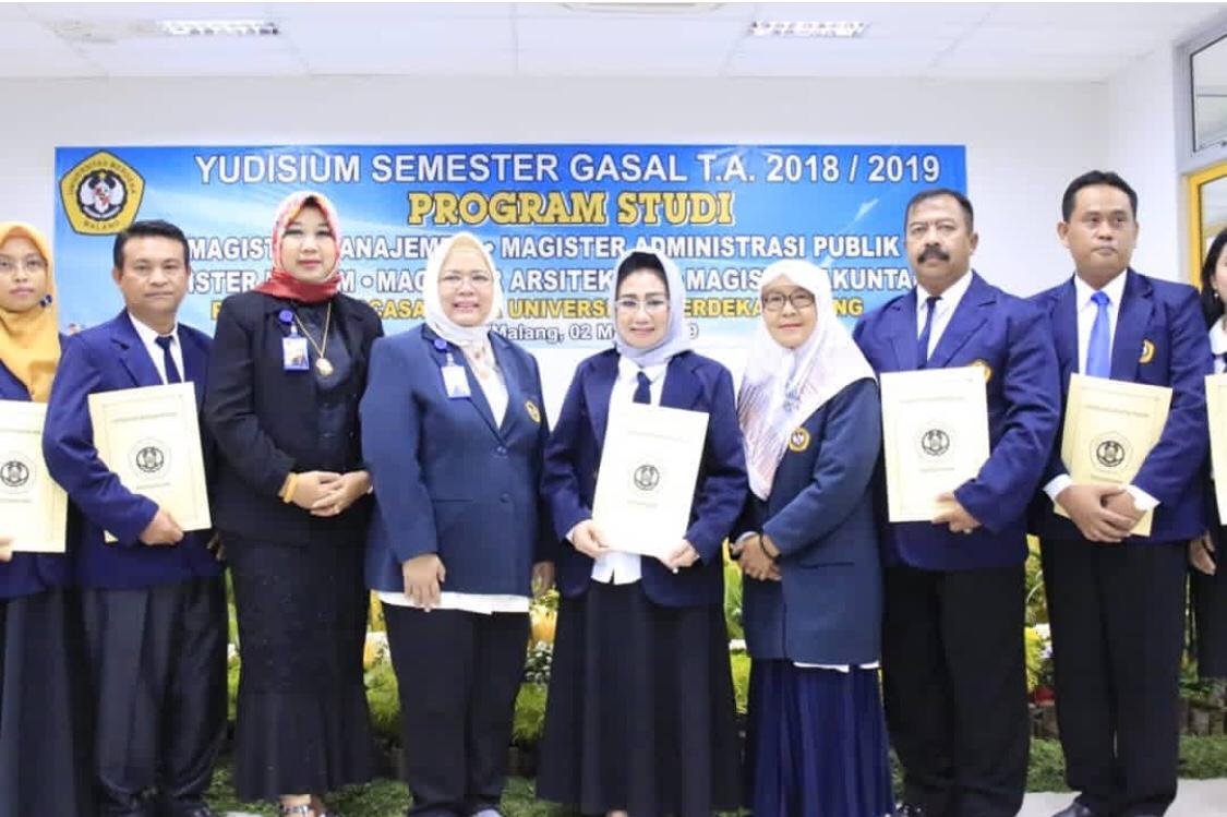 SELAMAT: Bunda Encek Firgasih (paling tengah) pasca sidang yudisium di Universitas Merdeka (Unmer) Malang dinyatakan lulus dan berhak menyandang gelas S2 Magister Administrasi Publik (MAP). Tampak Bunda Encek berfoto bersama dewan penguji dan deretan peserta sidang. (Foto: Ist)