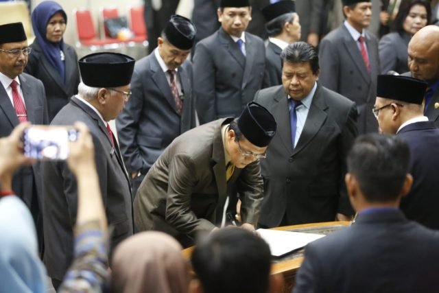 Kadisperindag Kutim H Zaini SE saat menandatangi disaksiksikan Bupati Ismunandar dan seluruh peserta yang hadir.(foto: Irfan Humas)