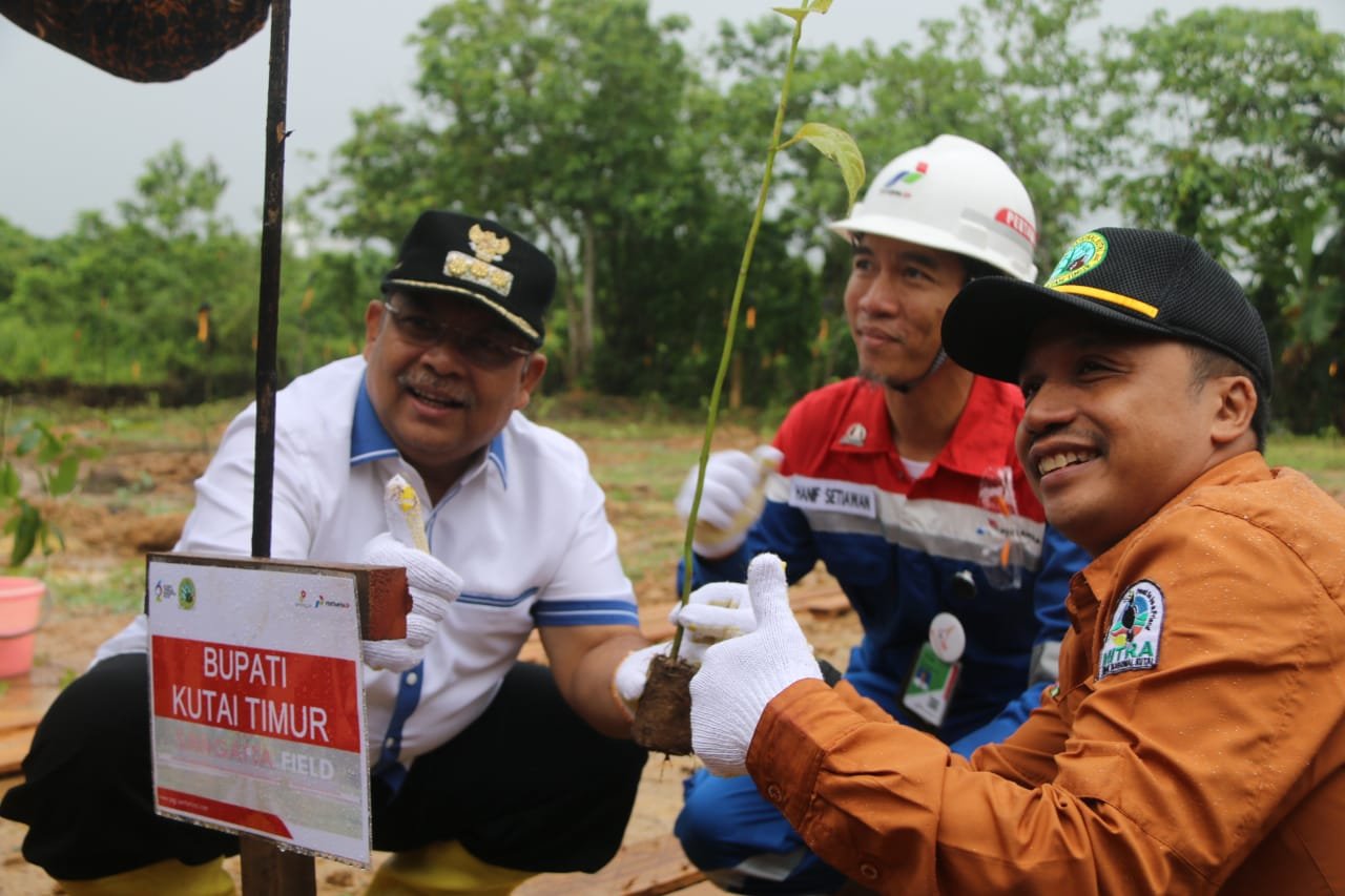 Meski masih hujan, tidak menyurutkan semangat Bupati Kutai Timur H Ismunandar, didampingi Kepala Balai TNK Nur Patria Kurniawan dan Field Manager PT Pertamina EP Asset 5 Sangatta Hanif Setiawan untuk melakukan penanaman pohon di area operasi Migas sumur pengeboran STW-05/STW-06 PT Pertamina EP Asset 5 Sangatta Field, Jum’at (13/12/2019).