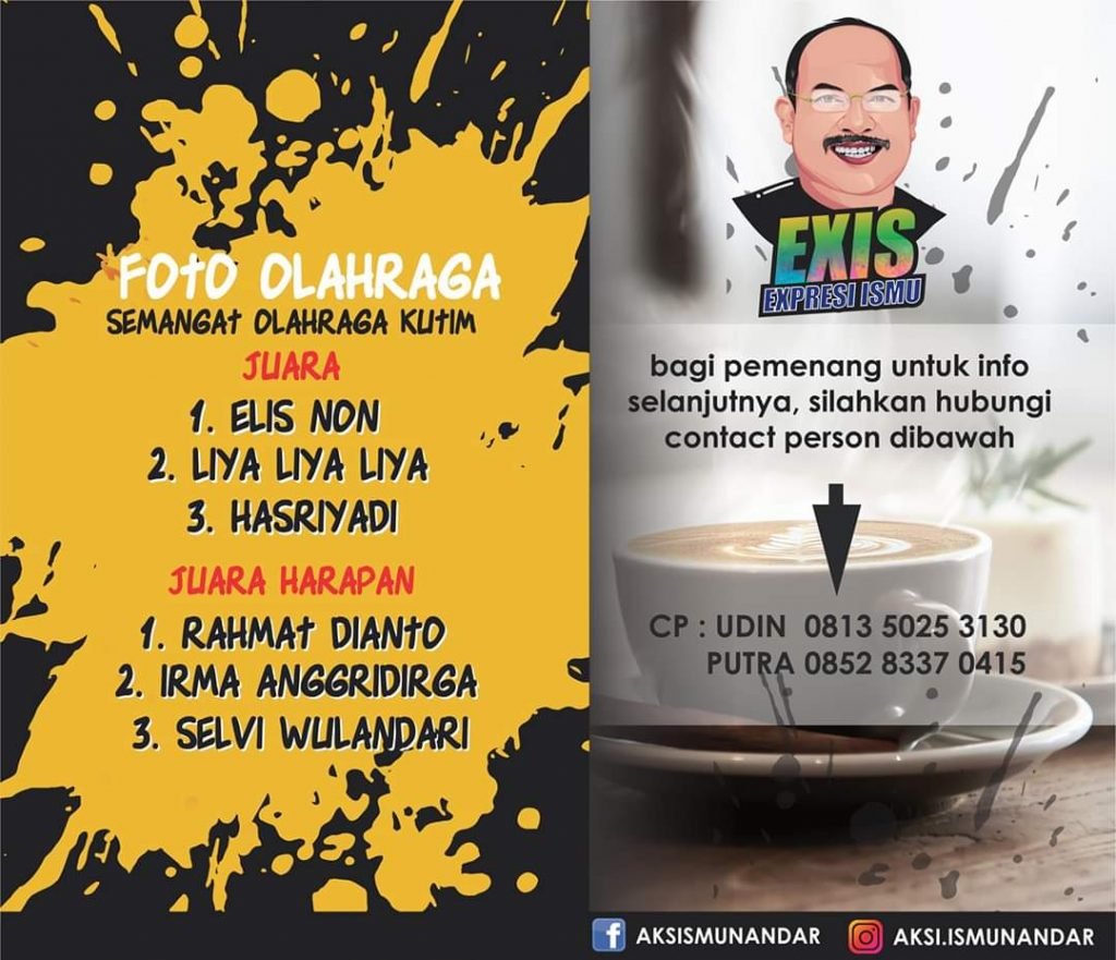 SANGATTA – Baru-baru ini akun facebook Aksi Ismunandar telah menghelat perlombaan sayembara foto dan swafoto dimedsos yang ramai diikuti para warga Kutai Timur (Kutim). Pada Rabu (12/2/2020) malam, akhirnya lomba tersebut dimenangkan 21 orang. Dari kategori sayembara cipta lagu, sayembara foto selfie, sayembara foto olahraga bertema objek wisata Kutim. Selain itu masih ada 10 orang mendapat apresiasi sebagai pemberi komentar terbaik.