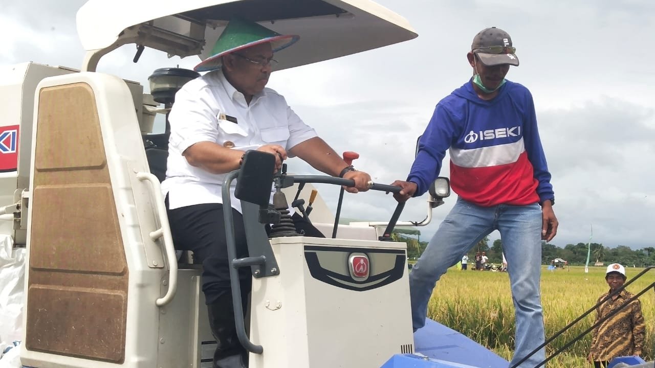 Bupati Ismunandar mencoba mesin panen padi dibimbing teknisi yang ada.(Wardi Pro Kutim)