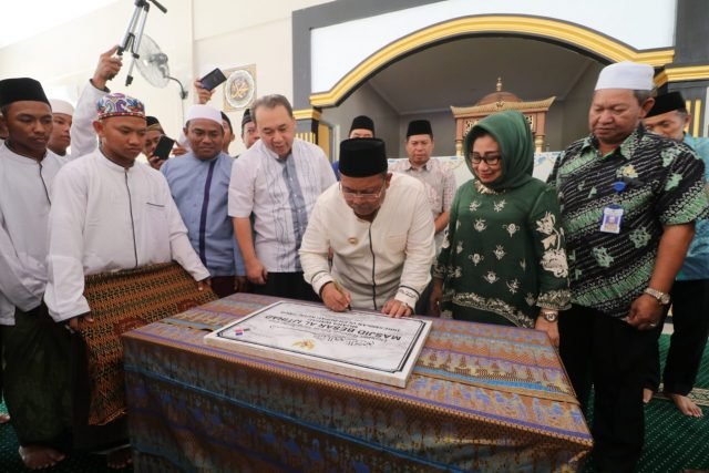 Bupati Kutim H Ismunandar menandatangani prasasti tanda diresmikannya Masjid Al Ijtihad Desa Muara Wahau, Kecamatan Muara Wahau. (Foto Jani Pro Kutim)