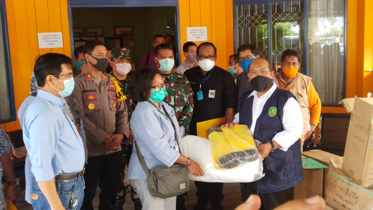 Bupati Kutim Ismunandar sebagai Ketua Gugus Tugas Penanganan Covid menerima bantuan APD dari KPC yang diserahkan Louise G Pessireron, Acting GM ESD didampingi Yorden Ampung. (Wardi Pro Kutim)