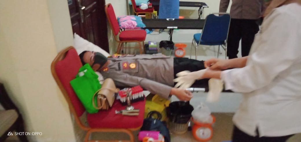 Jajaran Polres Kutim termasuk Kapolres AKBP Indras Budi Purnomo saat melakukan donor darah di Mapolres kawasan Bukit Pelangi di tengah pandemi COVID-19 (ist)