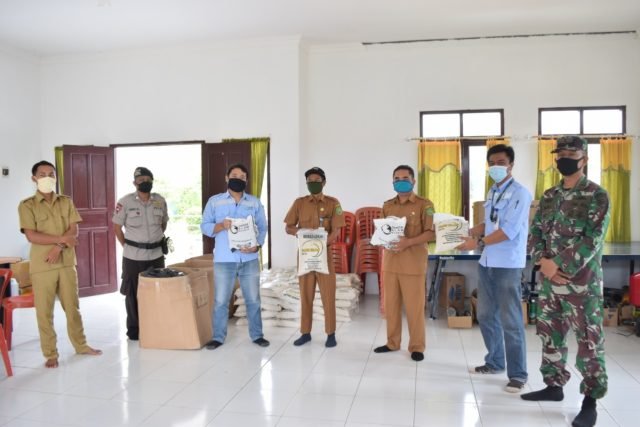 Camat Kaubun Riyanto menerima bantuan paket sembako dari perwakilan PT GAM disaksikan aparat TNI dan Polri setempat untuk dteruskan kepada masyarakat. (ist)