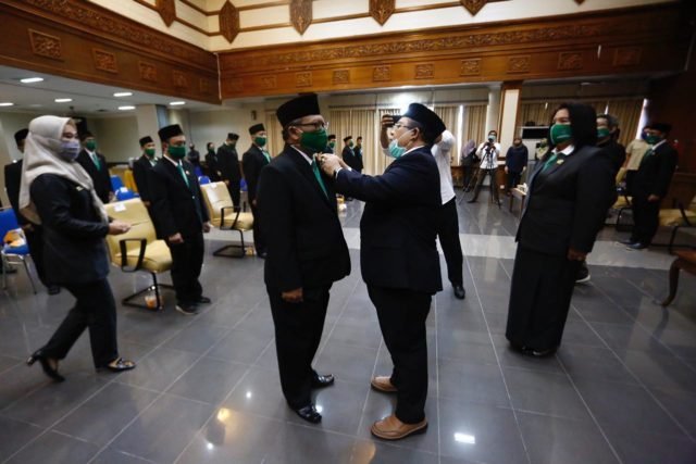 Bupati Kutim Ismunandar menyematkan pin kepada Ketua Dewan Pendidikan Kutim Eko Juniardy saat pelantikan kepengurusan Dewan Pendidikan Kutim. (Foto: Irfan Pro Kutim)