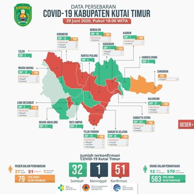 Sementara itu, data persebaran pandemi COVID-19 di Kutim untuk PDP berjumlah 79 kasus, negatif 27 kasus, proses ada 1 kasus. Total ODP sebanyak 583 kasus, selesai pemantauan 570 kasus, dalam pemantauan 13 kasus, total OTG 666 kasus, total PP monitoring 11.434 kasus, selesai pemantauan 10.442 kasus dan dalam pemantauan 1.012 kasus.