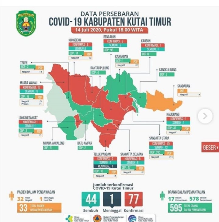 Untuk update data persebaran pandemi COVID-19 di Kutim per 14 Juli yaitu total konfirmasi adalah 77 kasus. Sembuh ada 44 kasus, meninggal 1 kasus, total PDP 33 kasus, negatif 32 kasus, proses 1 kasus, ODP 595 kasus, selesai : 578 kasus, proses 17 kasus, total OTG 813 kasus. (hms13/hms3)