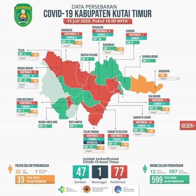 Selanjutnya ada KTM-53 adalah laki-laki usia 58 tahun. Kasus merupakan karyawan swasta melakukan perjalanan dari Manado. Pada 15 Juli dinyatakan sembuh setelah hasil swab evaluasi dua kali negatif berturut-turut. Masuk wilayah kerja Puskesmas Teluk Lingga. Berlanjut ke KTM-58 laki-laki usia 60 Tahun. Kasus merupakan pelaku perjalanan dari Banten. Pada 15 Juli dinyatakan sembuh setelah hasil swab evaluasi dua kali negatif berturut-turut, masuk wilayah kerja Puskesmas Sangatta Utara.
