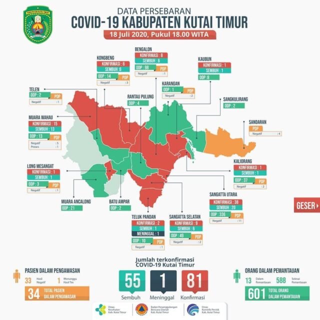 SANGATTA – Menjadi semakin mengkhawatirkan, pasalnya penambahan pasien terkonfirmasi positif COVID-19 di Kutim belum terbendung. Sabtu (18/7/2020), Dinas Kesehatan (Dinkes) Kutai Timur (Kutim) kembali mengeluarkan rilis resmi terkait data penyebaran COVID-19 lewat laman medsos instagram. Kepala Dinkes Kutim dr Bahrani melaporkan ada dua tambahan pasien terkonfirmasi positif COVID-19 yaitu KTM-80 dan KTM-81.