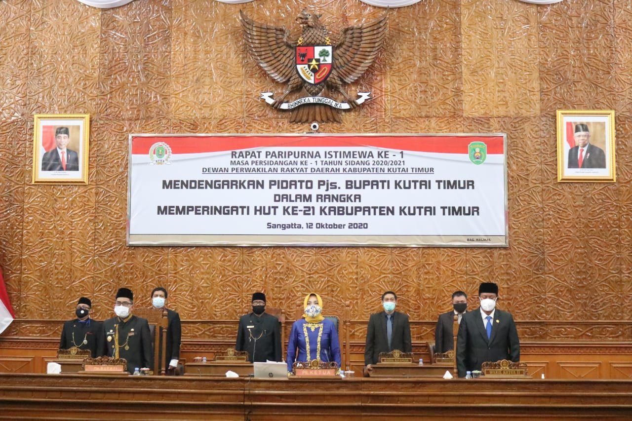 SANGATTA – Dimasa pandemi COVID-19 dan ditengah ketidak stabilan perekonomian Indonesia, Pemkab Kutim tetap melangsungkan peringatan hari jadi kabupaten yang ke 21. Tak ada upacara maupun pesta layaknya perayaan ulang tahun pada umumnya. Kali ini Rapat Paripurna Istimewa ke 1 di Gedung DPRD Kutim (Bukit Pelangi), dengan agenda mendengarkan pidato Pjs Bupati Kutim Moh Jauhar Efendi, menandai peringatan Hari Ulang Tahun (HUT) ke 21 Kutim, Senin (12/10/2020).