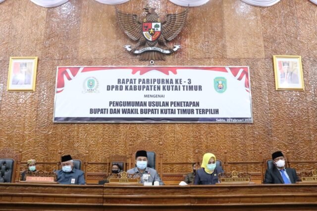 SANGATTA – DPRD Kutai Timur (Kutim) baru saja menggelar Rapat Paripurna ke-2 tentang usulan penetapan Bupati dan Wakil Bupati Kutim terpilih Ardiansyah Sulaiman dan Kasmidi Bulang (ASKB) periode 2021-2024 dipimpin Ketua DPRD Kutim Joni didampingi Wakil Ketua DPRD Kutim Asti dan Arfan di Ruang Sidang Paripurna Gedung DPRD Kutim, Sabtu (20/2/2021).