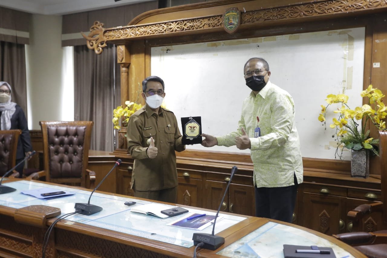 Deputi Kepala Perwakilan Bank Indonesia (BI) Kaltim Yudhistira menerima cenderamata dari Bupati Kutim Ardiansyah Sulaiman dalam audiensi rencana pembentukan TPP2D. Foto: Irfan/Pro Kutim