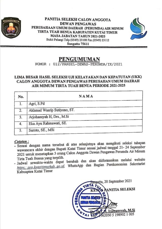 Ketua Pansel Calon Dewas Perumda Air Minum Tirta Tuah Benua Kutim Irawansyah menyebut ada lima nama hasil seleksi UKK calon Dewas PDAM Kutim priode 2021-2026. Satu nama yang lulus adalah dari pemerintahan adalah Asisten Perekonomian dan Pembangunan Suroto. Sedangkan 4 nama lainnya yakni Agri, Akhmad Wasrip Sutiyono, Arjohansyah dan Eka Ayu Rahmawati.