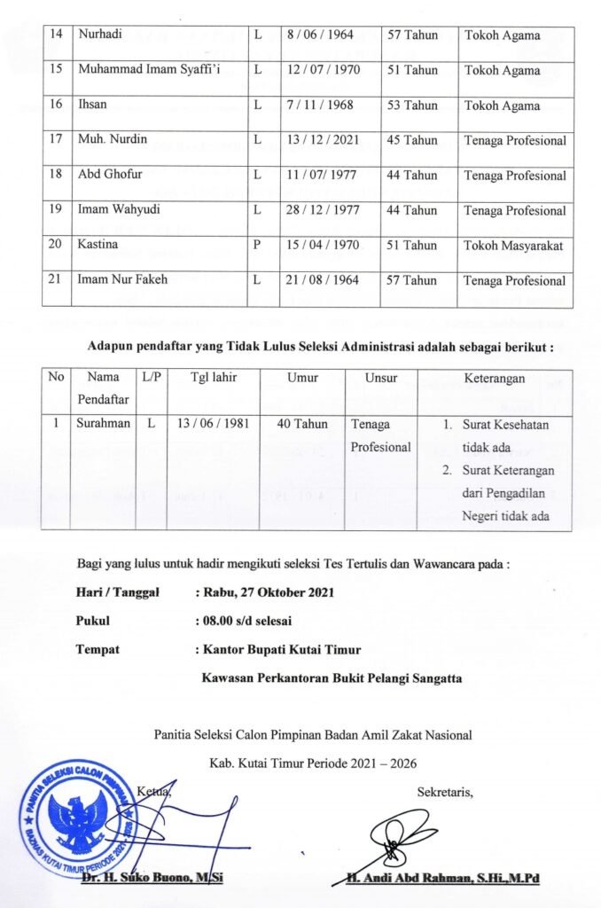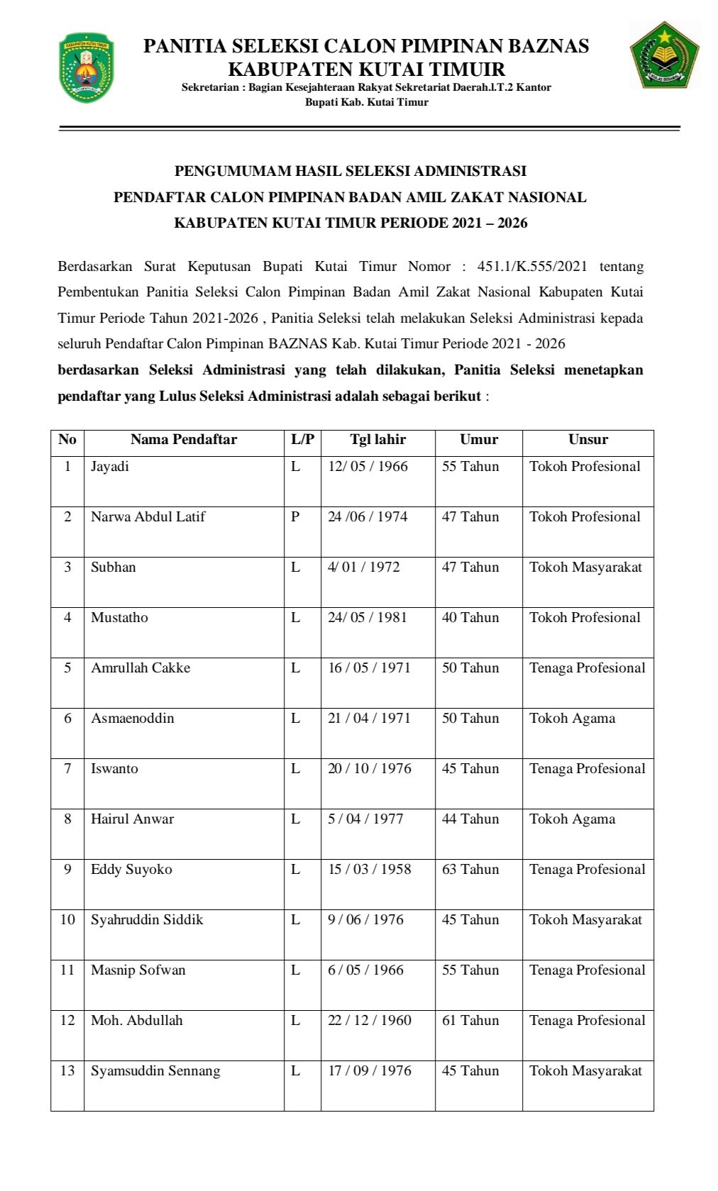 SANGATTA – Panitia Seleksi (Pansel) Calon Pemimpin Badan Amil Zakat Nasional (Capim BAZNAS) Kabupaten Kutai Timur (Kutim) berdasarkan Surat Keputusan Bupati Kutim Nomor : 451.1/K.555/2021 tentang Pembentukan Panitia Seleksi Capim Baznas Kutim Periode Tahun 2021-2026, menetapkan 21 pendaftar yang lulus hasil seleksi administrasi dan satu orang tidak lulus Capim BAZNAS 2021-2026.
