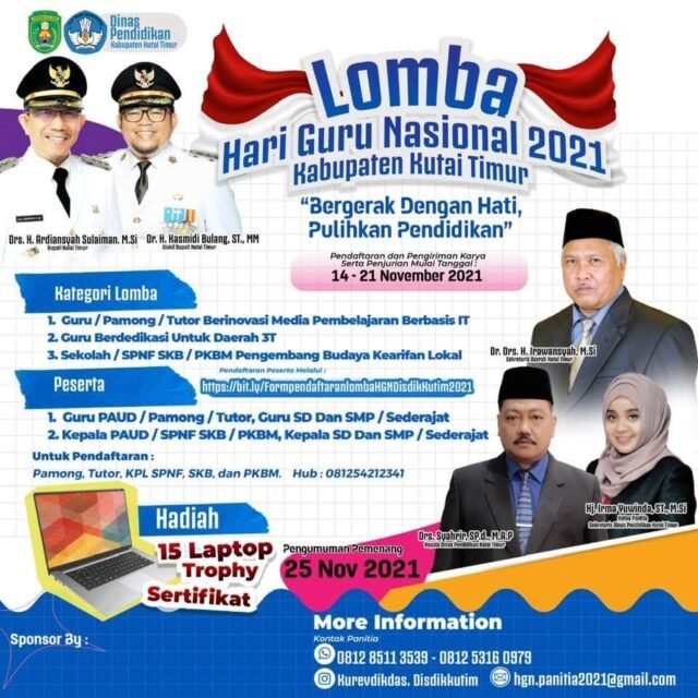 SANGATTA – Para guru di Kabupaten Kutai Timur (Kutim) bisa unjuk gigi menyuguhkan kemampuan terbaik menyambut peringatan Hari Guru Nasional (HGN) 25 November 2021. Pasalnya, Dinas Pendidikan (Disdik) Kutim menggelar lomba khusus untuk memeriahkan HGN tahun ini.