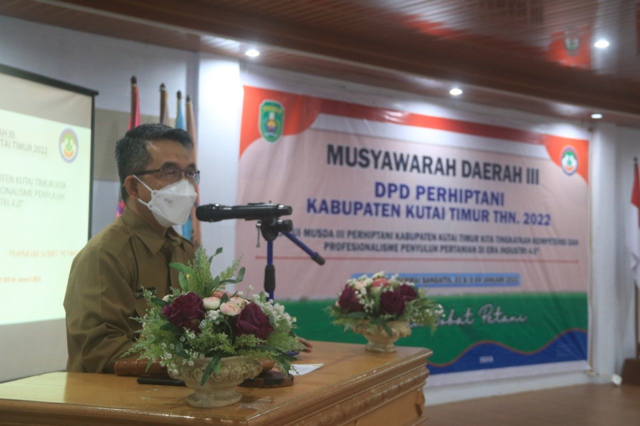 SANGATTA- Musyawarah Daerah III (Musda) Perhimpunan Penyuluh Pertanian Indonesia (Perhiptani) Kutim Tahun 2022, di Hotel Kutai Permai, Jalan Yos Sudarso 1, Selasa (4/1/2022) berlangsung lancar. Musda ini dibuka Bupati Kutim Ardiansyah Sulaiman.