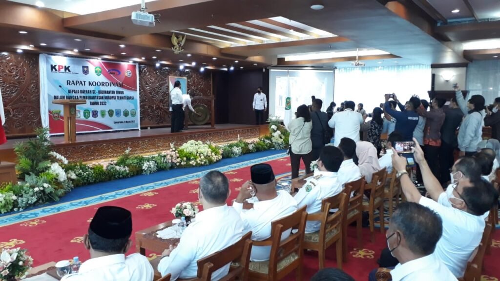 SAMARINDA- Rapat Koordinasi Kepala Daerah Se-Kalimantan Timur (Kaltim) Dalam Rangka Pemberantasan Korupsi Terintegrasi Tahun 2022 di Ruang Ruhui Rahayu, Kantor Gubernur Kaltim, Samarinda, Rabu (9/3/2022) turut dihadiri Bupati Kutim H Ardiansyah Sulaiman bersama sembilan kepala daerah se-Kaltim lainnya. Dari Kutim turut mendampongi Bupati yaitu Pj Seskab Yuriansyah, Kepala Ilwilkab Kutim Hamdan, Kepala BPKAD Teddy Febrian, Kabag Protokol Komunikasi Pimpinan Setkab Basuki Isnawan serta sejumlah staf. Kegiatan yang melibatkan KPK RI, BPKP, Pemprov Kaltim, Bea Cukai dan BPN ini, memghadirkan Wakil Ketua KPK RI Alexander Marwata, unsur Forkopimda serta pejabat lingkup Pemprov Kaltim. Kegiatan yang dirangkai dengan sesi penyampaian materi upaya pencegahan korupsi dan sesi dialog ini dibuka Wakil Gubernur Hadi Mulyadi. Ditandai dengan pemukulan gong.