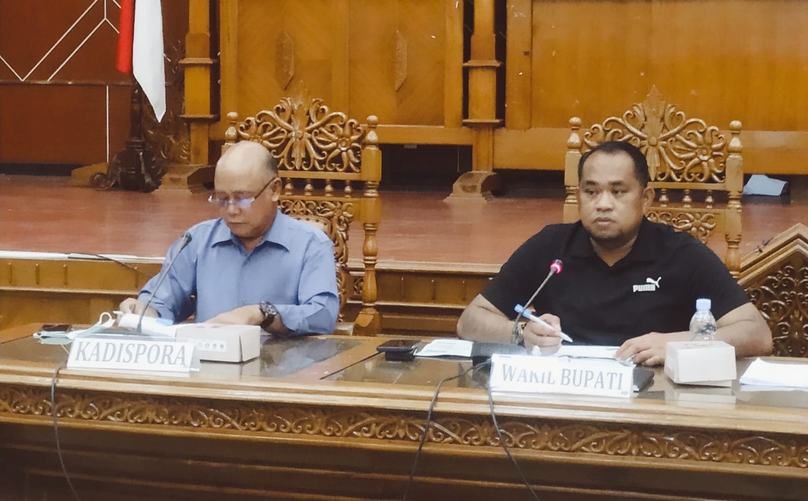 Aktualisasi – Kadispora Basrie (kiri) dan Wakil Bupati Kasmidi Bulang saat memimpin pertemuan dengan para pengurus cabor, terkait aktualisasi data dan informasi cabor. (Foto Ronall J Warsa – Pro Kutim)