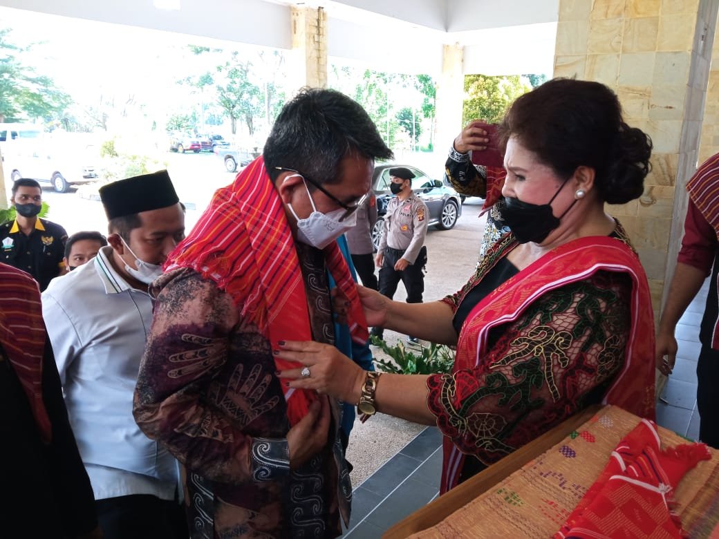 Bupati Karo Cory Setiawati Sebayang memberikan Uis Bekabuluh kepada Bupati Kutim H Ardiansyah Sulaiman saat menghadiri Pengukuhan pengurus DPC HMKI Kutim. Foto: Vian Pro Kutim