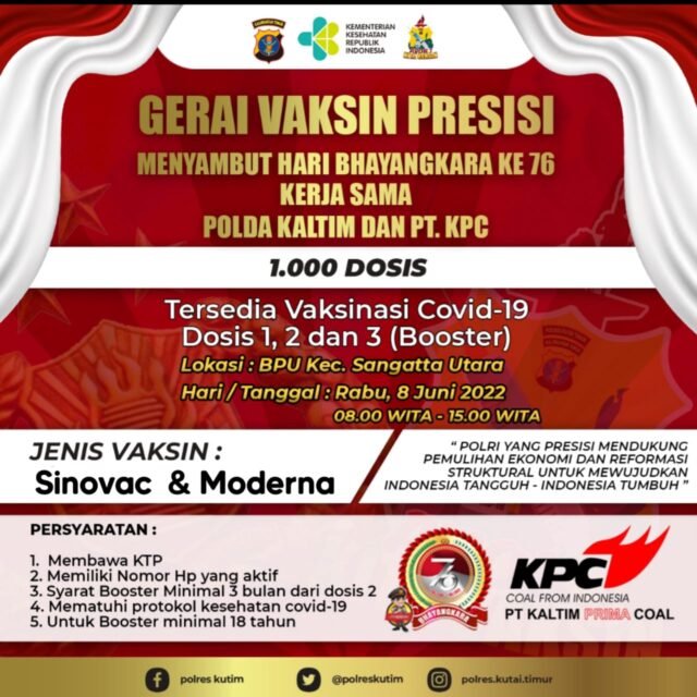 Hari ini pun kegiatan “Gelar Vaksin Presisi” turut digelar salah satunya dari Polres Kutim menyemarakkan Hari Jadi ke-76 Bhayangkara di lokasi Klinik Polres Kutim pada Jumat (4/6/2022). Polres Kutim pun mempersilakan bagi warga Kutim yang ingin melakukan vaksinasi mulai dari vaksin 1, 2 dan booster.