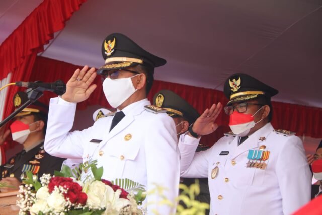 SANGATTA – Cuaca cerah mengiringi pelaksanaan upacara puncak peringatan Hari Ulang Tahun (HUT) Kemerdekaan ke 77 Republik Indonesia (RI) tingkat Kabupaten Kutai Timur (Kutim) yang dipusatkan di Halaman Kantor Bupati, Komplek Pusat Perkantoran Pemkab di Bukit Pelangi, Rabu (17/8/2022) pagi. Nampak di barisan peserta upacara berbaris rapi di lapangan terdiri dari unsur TNI-Polri, Satpol PP, Personel Pemadam Kebakaran dan Penyelamatan, ASN yaitu PNS dan TK2D Pemkab, organisasi kemasyarakatan, mahasiswa beberapa kampus dan siswa perwakilan sekolah.