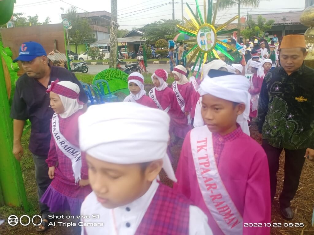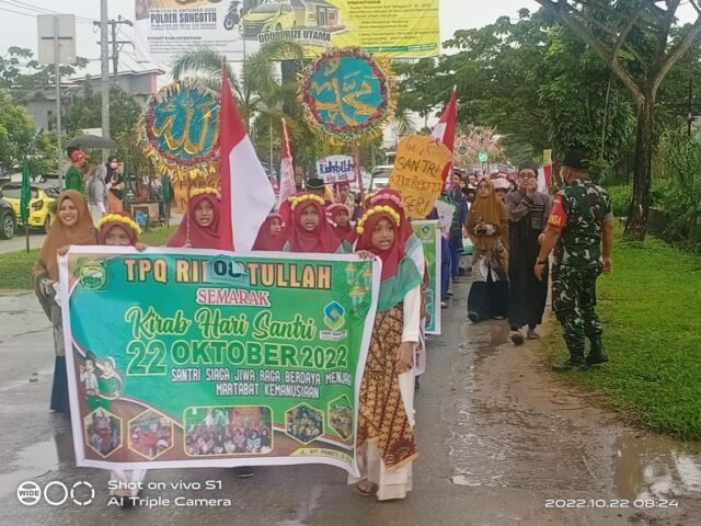 SANGATTA – Peringatan Hari Santri 2022 di Kabupaten Kutai Timur berlangsung meriah, Sabtu (22/10/2022). Kegiatan diisi dengan pelaksanaan kirab dengan rute awal mulai Jalan Margo Santoso dan berakhir di Lapangan IKJ Jalan Abdul Wahab Syaranie, Sangatta Utara untuk kemudian dirangkai dengan apel. Kendati hujan mengguyur Kota Sangatta sebelum pelaksanaan kegiatan, namun nyatanya tak menyurutkan langkah para santriwan dan santriwati dari berbagai TPA/TKA untuk hadir dan memeriahkan Hari Santri 2022.