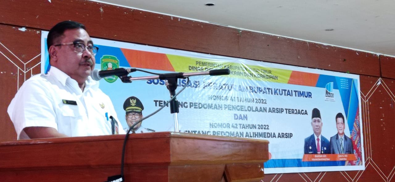 SANGATTA – Sebagai upaya menjaga kualitas pengelolaan kearsipan agar teradministrasi dengan baik diperlukan langkah-langkah konkret mengikuti aturan kerasipan nasional yang terintegrasi dan berkekuatan hukum. Hal inilah yang difokuskan oleh Dinas Perpustakaan dan Kerasipan (Dispusip) Kutai Timur (Kutim) pada kegiatan Sosialisasi Perbup Nomor 41 Tahun 2022 Tentang Pedoman Pengelolaan Arsip Terjaga dan Nomor 42 Tahun 2022 Tentang Pedoman Alih Media Arsip di Ruang Akasia GSG Bukit Pelangi, Rabu (9/11/2022).