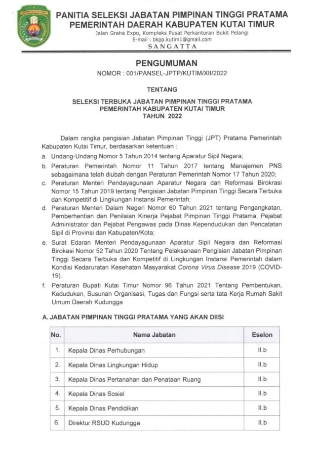 Hal ini berdasarkan surat pengumuman Nomor: 001/PANSEL-JPTP/KUTIM/XII/2022, tentang seleksi terbuka JPT Pratama Pemkab Kutim yang ditandatangani Seskab Kutim Rizali Hadi selaku Ketua Panitia Seleksi (Pansel) pendaftaran dibuka mulai 8-14 Desember 2022. Apabila pendaftar kurang dari tiga orang maka pendaftaran diperpanjang mulai 15 Desember sampai dengan 19 Desember 2022.