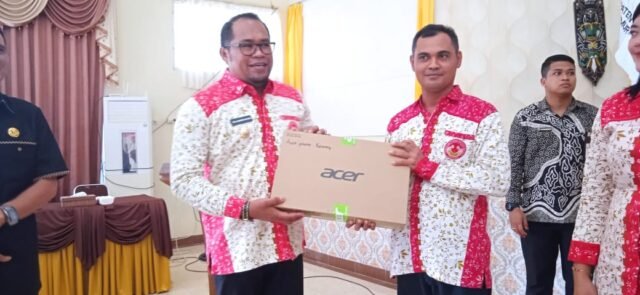 Momen penyerahaan Laptop oleh Kasmidi Bulang kepada PPL. (Wahyu Pro Kutim)