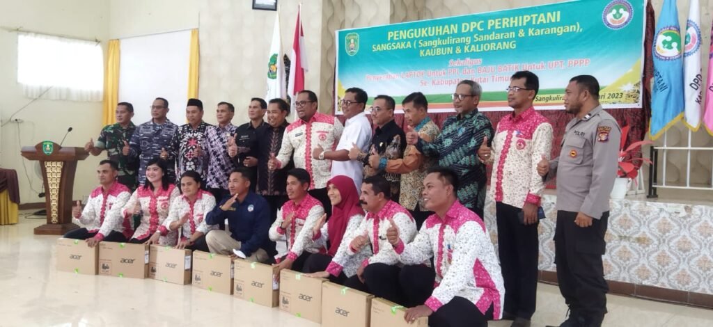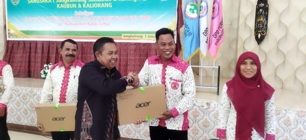 SANGAKULIRANG – Dewan Pengurus Daerah (DPD) Perhimpunan Penyuluh Pertanian Indonesia (Perhiptani) Kutai Timur (Kutim) mendukung peningkatan semangat bekerja para Penyuluh Pertanian Lapangan (PPL). Sehubungan hal itu, PPL di Sangkulirang, Sandaran, Karangan, Kaubun dan Kaliorang (Sangsakaukar) diberi fasilitas penunjang kerja berupa laptop dan baju batik. Khususnya bagi setiap PPL yang berstatus PNS dan P3K. Penyerahan bantuan dilakukan oleh Ketua DPD Perhiptani Kutim H Kasmidi Bulang yang juga menjabat Wakil Bupati (Wabup) Kutim, usai mengukuhkan tiga DPC Perhiptani di Gedung BPU Kantor Camat Sangkulirang, Kamis (5/1/2023) siang.