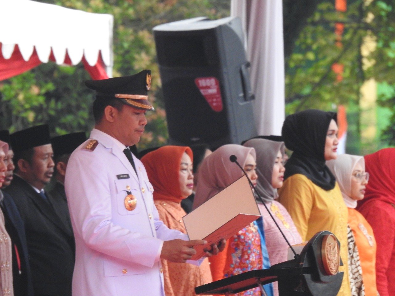 Walikota Samarinda Dr H Andi Harun membacakan Sambutan pada Upacara Hari Jadi Kota Samarinda Ke 355 dan Pemkot Samarinda ke 47. Dilapangan Parkir GOR Segiri Samarinda, Sabtu, 21/1/2023. Foto: Aulia Miranda Pro Kutim