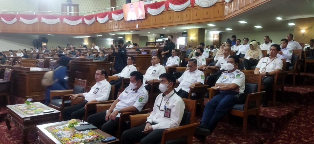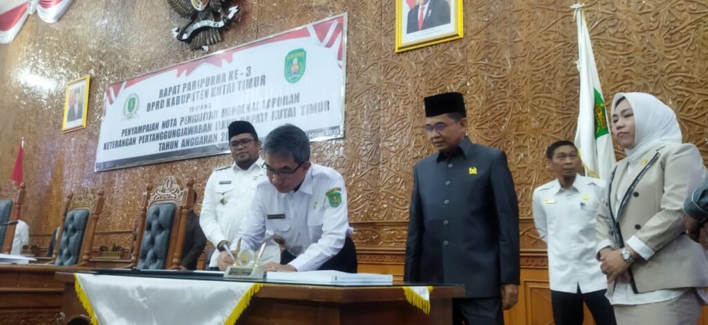 SANGATTA – Penyampaian keterangan Laporan Pertanggungjawaban (LKPJ) Bupati Kutai Timur (Kutim) Tahun Anggaran (TA) 2022 disampaikan langsung oleh Bupati Ardiansyah Sulaiman, saat Rapat Paripurna ke-3 DPRD Kutim, di Ruang Sidang Utama, Kantor DPRD Kutim, Rabu (29/3/2023). Rapat Paripurna dipimpin Ketua DPRD Kutim Joni didampingi Wakil Ketua I DPRD Kutim Asti Mazar, Wakil Ketua II DPRD Arfan dan dihadiri 24 anggota lainnya. Tampak hadir pula dalam rapat itu Wabup Kasmidi Bulang, para asisten, jajaran pejabat eselon 2 dan 3, perwakilan stakeholder dan undangan lainnya.