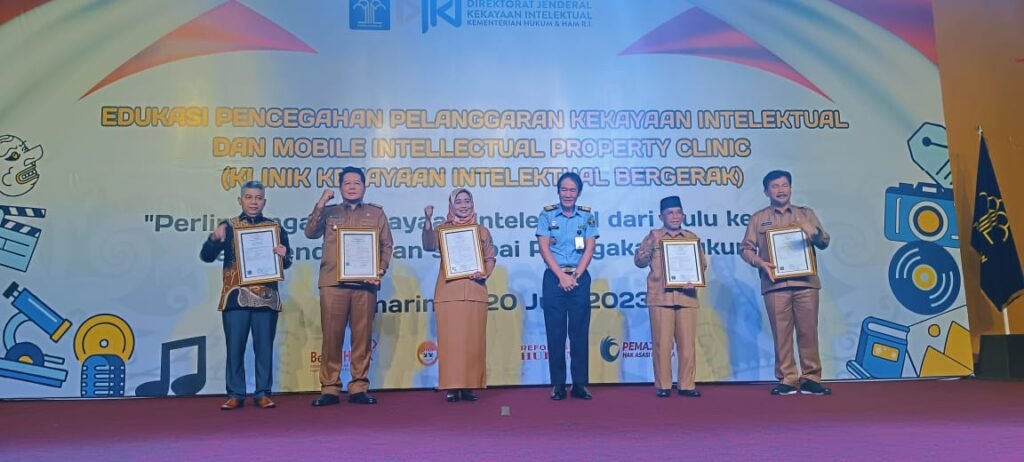 SAMARINDA – Kain Tenun Rakat khas Kutai Timur (Kutim) dan Tari Hudog dari suku Dayak Kalimantan mendapatkan pengakuan dari lembaga hukum. Yakni dari Kanwil Kementerian Hukum dan HAM (Kemenkumham) Kaltim. Keduanya berhasil memperoleh sertifikat Kekayaan Intelektual Komunal (KIK). Untuk sertifikat KIK kain tenun rakat diterima oleh Sekretaris Dinas Pariwisata (Dispar) Kutim Tirah Satriani yang tercatat sebagai pencipta kain Tenun Rakat. Sedangkan sertifikat KIK Tari Hudog diterima oleh Asisten Perekonomian dan Pembangunan (Perekobang) Seskab Kutim Zubair yang diserahkan secara simbolis oleh Kepala Kanwil Kemenkumham Kaltim Sofyan di Ballroom Aston Samarinda Hotel & Convention Center, Selasa (20/6/2023).