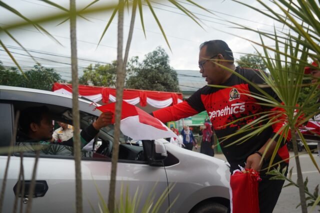 SANGATTA – Momentum menyambut HUT ke-78 Kemerdekaan RI lewat gerakan nasional pembagian 10 juta bendera merah putih serentak di seluruh Indonesia turut digelar di Kabupaten Kutai Timur (Kutim) melalui panitia Badan Kesbangpol, tepatnya di area Simpang Tiga Jalan AW Sjahranie (Eks Pendidikan) pada Jumat (11/8/2023). Kegiatan ini langsung dipimpin oleh Wabup Kutim Kasmidi Bulang didampingi Kapolres Kutim Ronni Bonic dan jajaran perwakilan Forkopimda, Kepala Badan Kesbangpol Muhammad Basuni, Ketua TP PKK Kutim Siti Robiah dan Wakil Ketua TP PKK Kutim Tirah Satriani bersama undangan lainnya.