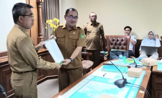 Bupati Ardiansyah Sulaiman serahkan SK Pembentukan Forum Pengawasan Kawasan Ekosistem Penting LBMS pada Kepala DLH Kutim Armin Nazar. (Foto Ronall J Warsa Pro Kutim)
