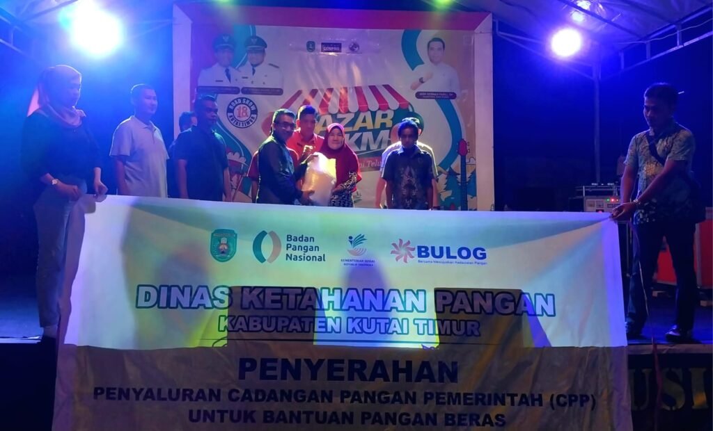 TELUK PANDAN – Pemerintah Kabupaten Kutai Timur (Kutim) melalui Dinas Ketahanan Pangan (DKP) dan Perusahaan Umum (Perum) Bulog Cabang Samarinda menyalurkan cadangan pangan pemerintah (CPP) tahap kedua tahun 2023. Total beras yang disalurkan sebanyak 1.337, 8 ton untuk 13.378 jiwa penerima manfaat dari 18 kecamatan dan 141 desa. Penyerahan secara simbolis dilakukan oleh Bupati Kutim Ardiansyah Sulaiman di area Road Show Promosi Bazar UMKM Desa Teluk Pandan, Jum’at (29/9/2023) malam.