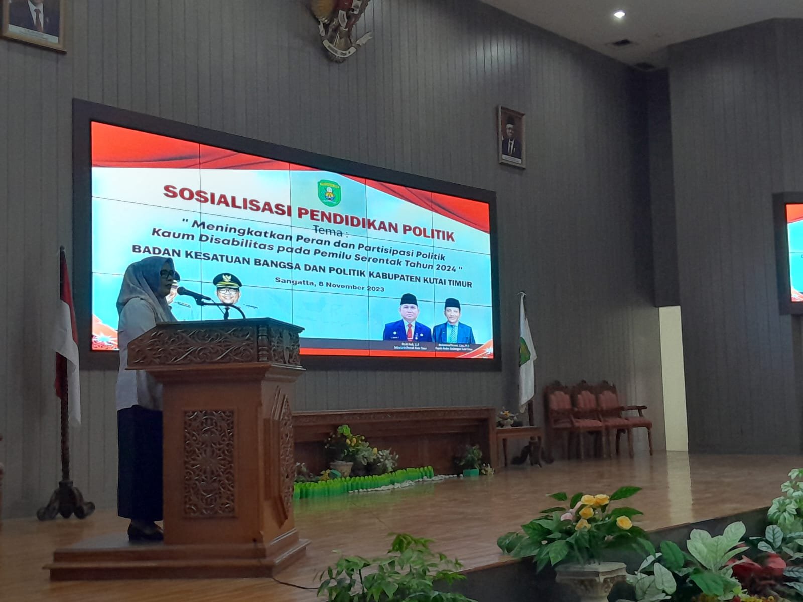 “Penyandang disabilitas menjadi kelompok rentan terabaikan dalam perhelatan politik termasuk pemilu. Padahal hak-hak konstitusional sudah diatur dalam UU Nomor 8 tahun 2016 tentang ragam dan hak penyandang disabilitas, pelaksanaan penghormatan, pelindungan, dan pemenuhan hak penyandang disabilitas,” jelas Staf Ahli Bupati Bidang Perekonomian Pembangunan dan Keuangan Hj Sulastin, mewakili Bupati Kutai Timur (Kutim) saat membuka kegiatan Sosialisasi Pendidikan Politik, di Ruang Meranti, Sekretariat Kabupaten pada Rabu (8/11/2023).