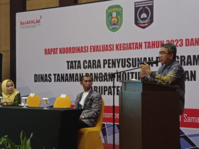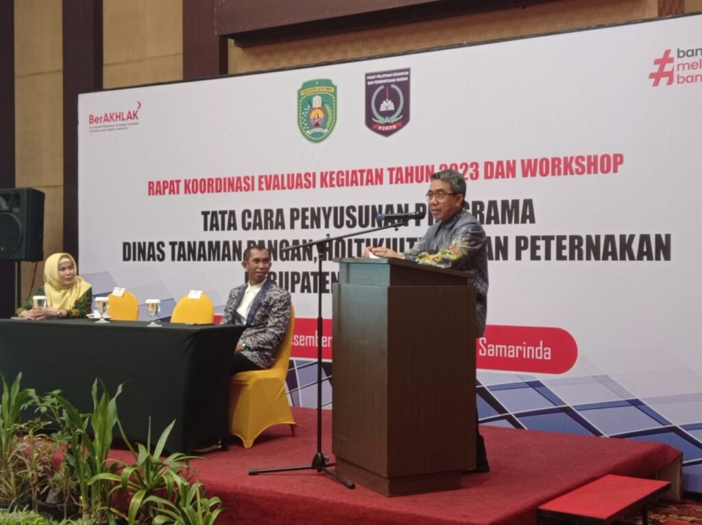 SAMARINDA – Sejumlah perencanaan program prioritas dibahas dalam gelaran Rapat Koordinasi Evaluasi Kegiatan Tahun 2023 dan Workshop Tata Cara Penyusunan Programa Dinas Tanaman Pangan, Hortikultura dan Peternakan (DTPHP) Kabupaten Kutai Timur (Kutim) bekerja sama dengan Pusat Pelatihan Keuangan dan Pemerintah Daerah (P2KPD) yang digelar Queen Marry 1 Meeting Room Aston Samarinda Hotel & Convention, Jumat (1/12/2023) malam. Kegiatan ini diikuti ratusan peserta yang terdiri dari 3 orang dari perwakilan penyuluh pertanian lapangan (PPL) yang berasal dari UPT dan Keswan DTPHP di masing-masing 18 kecamatan se-Kutim dan dibuka langsung oleh Bupati Kutim Ardiansyah Sulaiman didampingi Kepala DTPHP Kutim Dyah Ratnaningrum dan Ketua P2KPD Jamaluddin Arsyad.