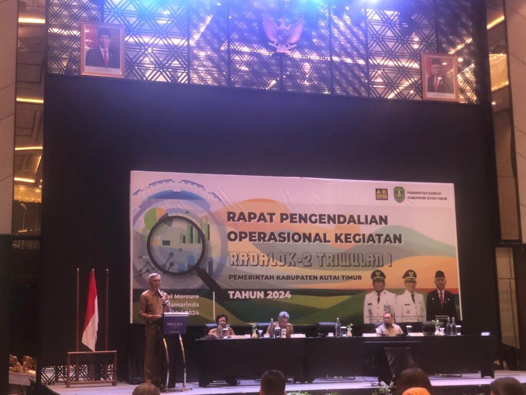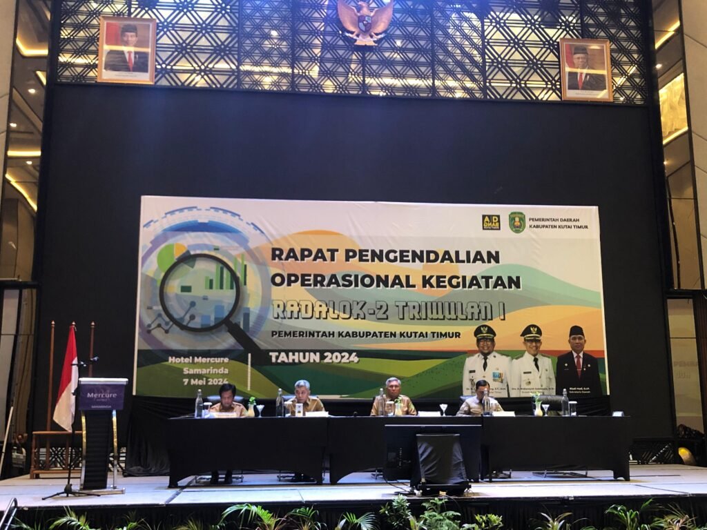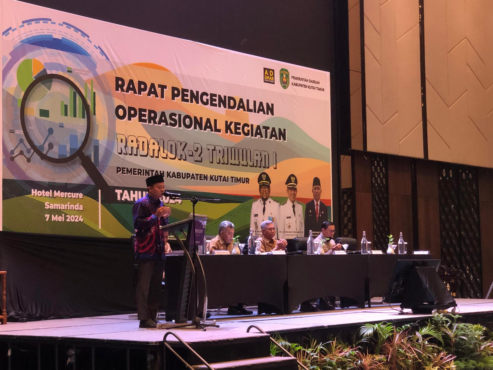 SAMARINDA – Rapat Pengendalian Operasional Kegiatan (Radalok) 2 Triwulan I yang digelar oleh Bagian Administrasi Pembangunan Sekretariat Kabupaten Kutai Timur (Kutim)dihadiri langsung oleh Sekretaris Kabupaten (Seskab) Kutim Rizali Hadi didampingi Asisten Perekonomian dan Pembangunan Zubair, Asisten Administrasi Umum Sudirman Latif, Kepala Bagian Administrasi Pembangunan Insan Bowo Asmoro, seluruh Camat se-Kabupaten Kutim, pejabat eselon III yang hadir dan perwakilan perangkat daerah (PD) di lingkungan Pemkab Kutim di Ruang Crystal 1 Hotel Mercure, Selasa (7/5/2024).