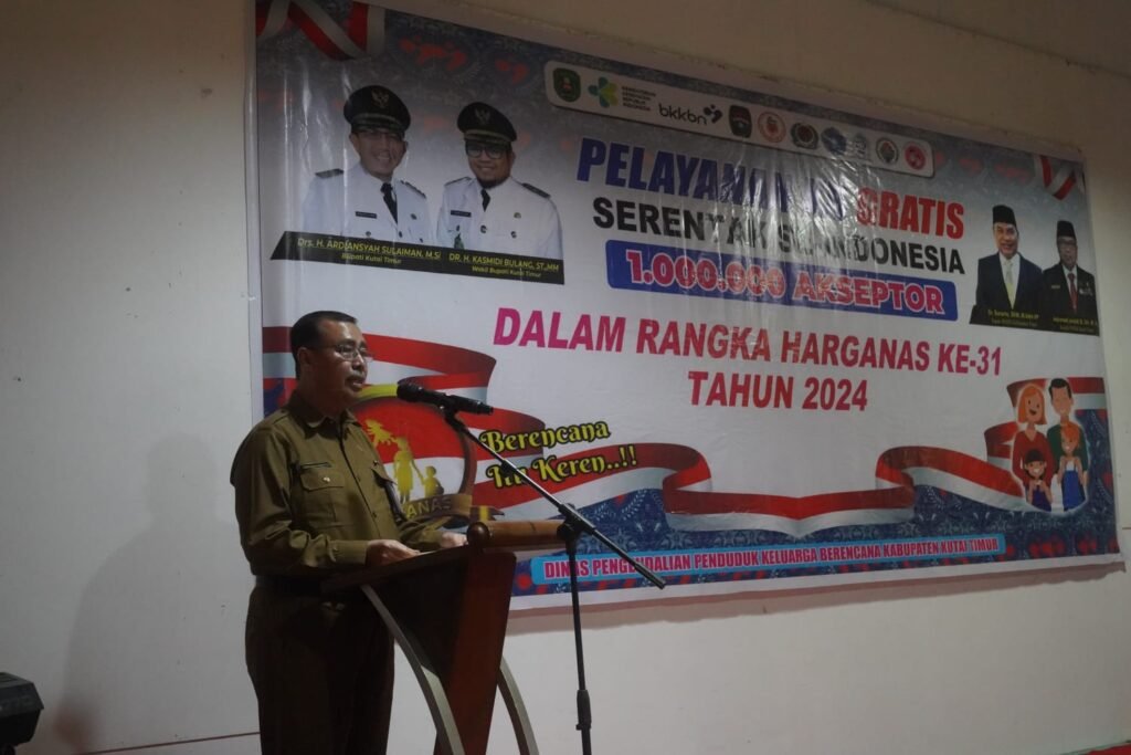 Dalam laporannya, Kepala DPPKB Kutim Achmad Junaidi dari 1 juta akseptor seluruh Indonesia, target Kutim tahun 2024 ini sebesar 2.328 akseptor. Pelayanan KB bertujuan mewujudkan keluarga yang berkualitas di antaranya menjaga kesehatan dan menurunkan angka kematian ibu, bayi dan anak, meningkatkan akses kualitas informasi pendidikan, konseling, pelayanan keluarga berencana dan kesehatan reproduksi. Kemudian meningkatkan partisipasi dan kesertaan pria dalam praktik keluarga berencana serta mempromosikan penyusunan bayi untuk menjarangkan jarak kehamilan,” urainya disaksikan Asisten Pemkesra Poniso Suryo Renggono, Ketua TP PKK Kutim Siti Robiah dan undangan lainnya yang hadir.
