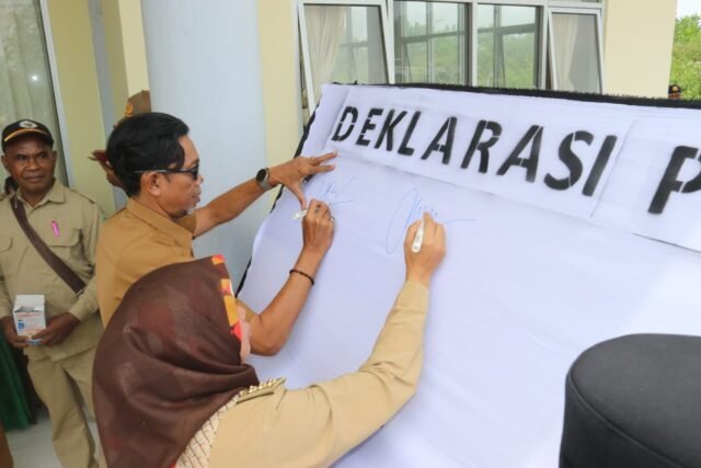 Pjs Bupati Kutim Agus Hari Kesuma bersama Forkopimcam,Kepala Desa serta perangkat desa se Kecamatan Rantau Pulung menandatangani Deklarasi Pilkada Damai. Foto: Vian Pro Kutim