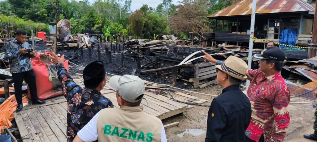 TELEN- Badan Amil Zakat Nasional (Baznas) Kabupaten Kutai Timur (Kutim) memberikan santunan sebesar 65 juta rupiah kepada enam rumah yang menjadi korban kebakaran di Desa Kernyanyan, Kecamatan Telen, Kutim pada Kamis (5/12/2024). Penyerahan ini diberikan langsung oleh Ketua Baznas Kutim KH Masnif Sofwan disaksikan Bupati Ardiansyah Sulaiman. Sementara paket sembako dan sandang dari Dinas Sosial Kutim diberikan kepada 7 kepala keluarga yang tertimpa kebakaran diberikan oleh Buapti Ardiansyah Sulaiman didampingi Kepala Dinas Sosial Kutim Ernata Hadi Sujito,Camata Telen,Petrus Ivung, Kepala Desa Kernyanyan,Samiun disaksikan warga sekitar. Selain santunan uang tunai, korban kebakaran juga menerima 7 paket santunan sembako dan sandang dari Dinas Sosial Kutim. Santunan ini merupakan bagian dari upaya Baznas dan Dinas Sosial Kutim untuk membantu meringankan beban warga yang terdampak bencana kebakaran yang terjadi beberapa waktu lalu.Kebakaran tersebut menghanguskan rumah-rumah warga dan mengakibatkan kerugian material yang cukup besar.