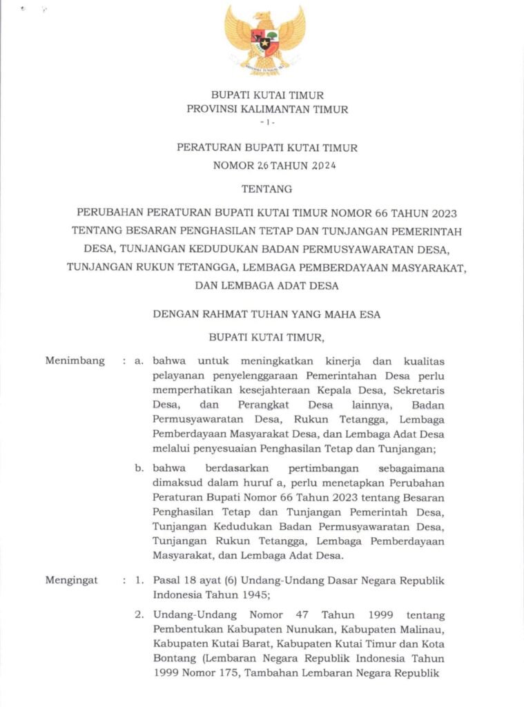 Kebijakan ini dituangkan dalam Peraturan Bupati (Perbup) Kutim Nomor 26 Tahun 2024, yang merupakan perubahan atas Perbup Kutim Nomor 66 Tahun 2023. Dalam aturan tersebut, penyesuaian gaji dan tunjangan dianggarkan melalui Alokasi Dana Desa (ADD) yang telah disesuaikan dengan besaran pagu ADD tahun ini