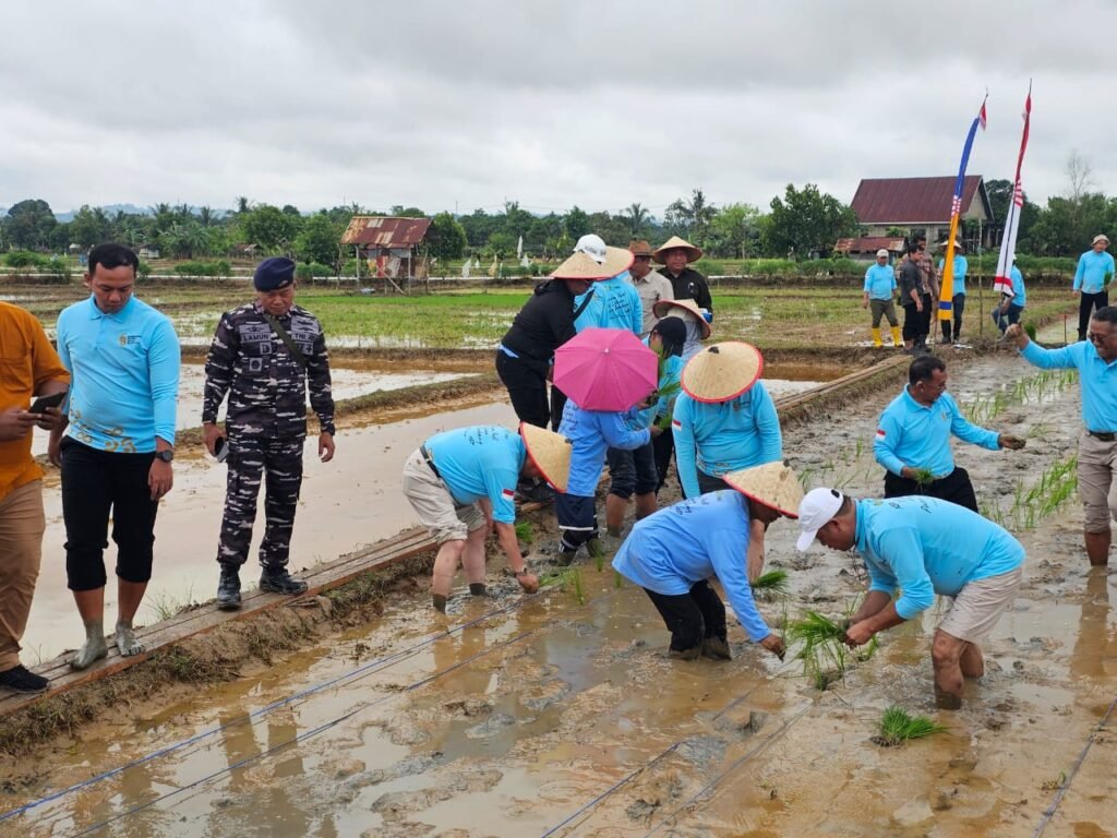 Asistem Pemkesra Seskab Kutim Poniso Suryo Renggono ikut dalam momen menanam padi di lahan eks tambang PT BBE. Foto: Irfan/Wahyu Pro Kutim