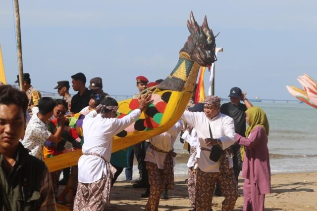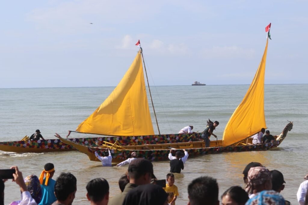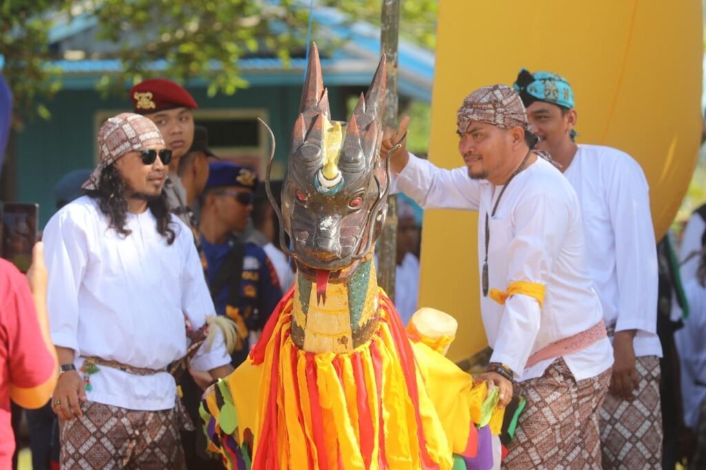 Perahu naga berwarna kuning cerah itu dihiasi pernak-pernik berwarna-warni yang menyerupai sisik naga dalam mitologi lokal, lengkap dengan layar kuning sebagai simbol kekuatan mistik dan ikatan spiritual dengan leluhur. Suasana menjadi khidmat ketika gamelan khas Kutai mengiringi pelarungan perahu, berpadu dengan desir angin pantai yang lembut. Usai prosesi, masyarakat turut serta mengambil kain pembungkus perahu naga sebagai bagian dari adat, tanda keterlibatan kolektif dalam menjaga tradisi.