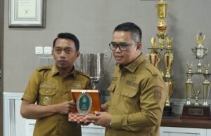 Wakil Bupati Kutim Mahyunadi dan Bupati Sidrap Syaharuddin Alrif bertukar cenderamata, tanda kekompakan sinergitas kedua daerah dalam pengoptimalan lahan pertanian. Foto: Irfan/Pro Kutim