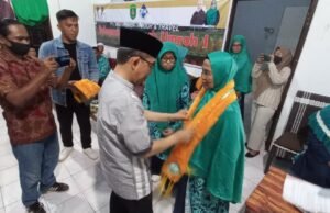 Bupati Ardiansyah saat mengalungi secara simbolis jamaah keberangkatan umrah Kutim. (Wahyu/Pro Kutim).