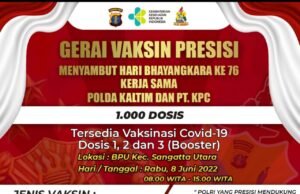 SANGATTA- Kepolisian Daerah (Polda) Kalimantan Timur (Kaltim) sukses menggelar vaksinasi massal COVID-19 dosis 1, 2 dan 3 (booster), dengan target 1000 dosis, di Sangatta,...